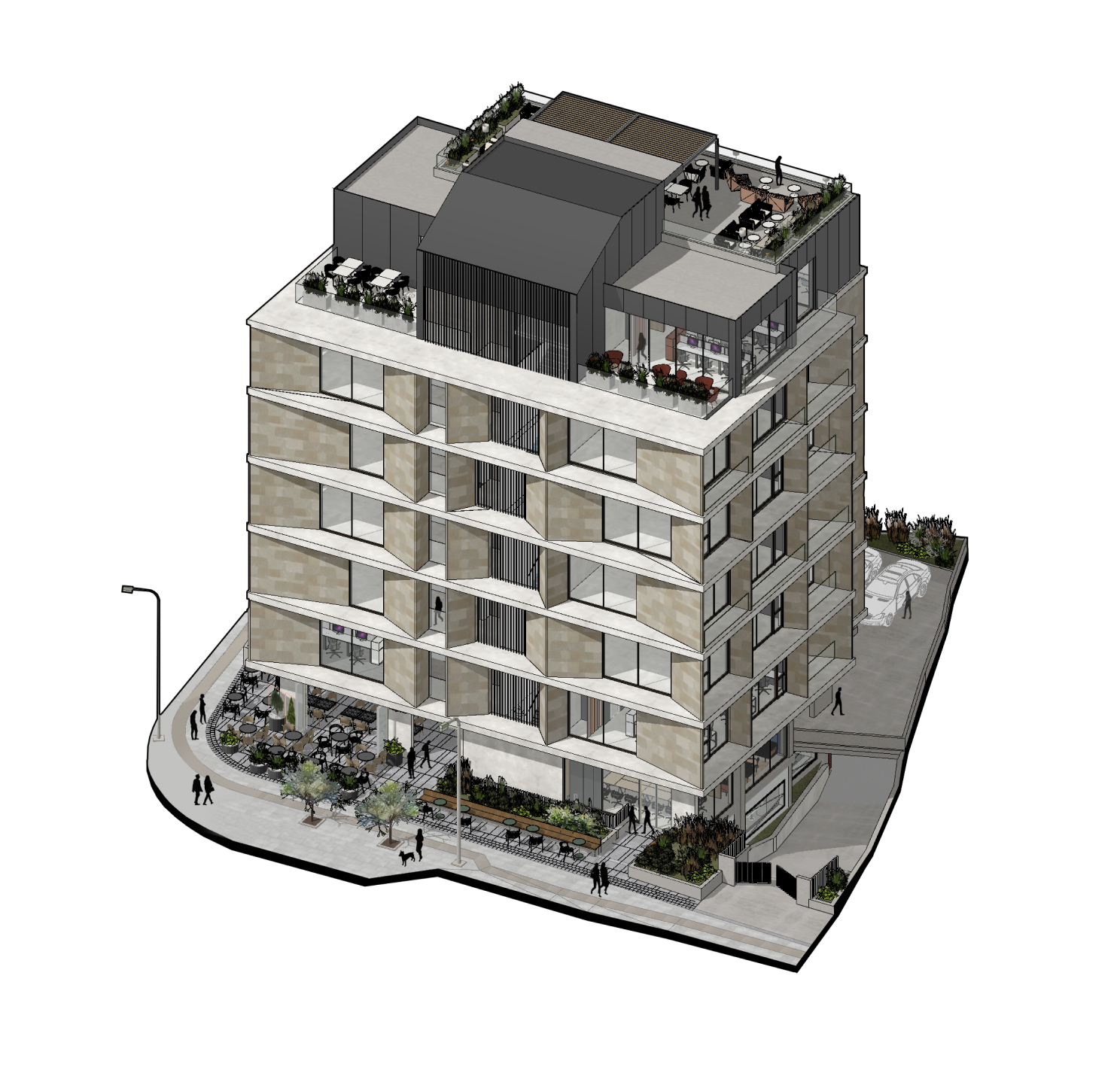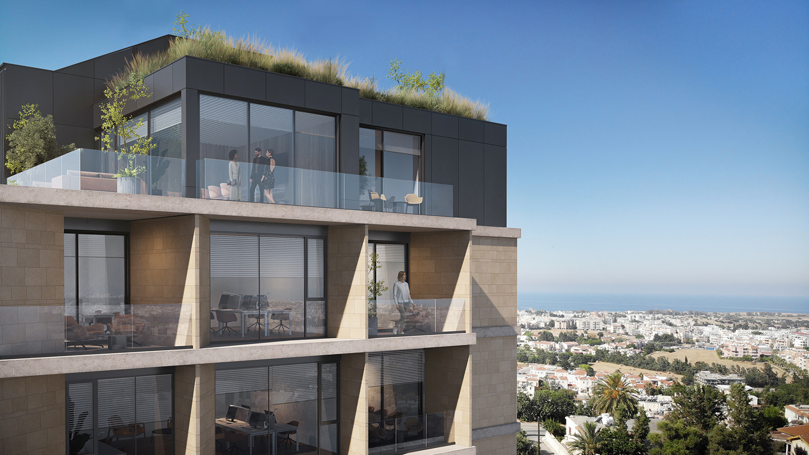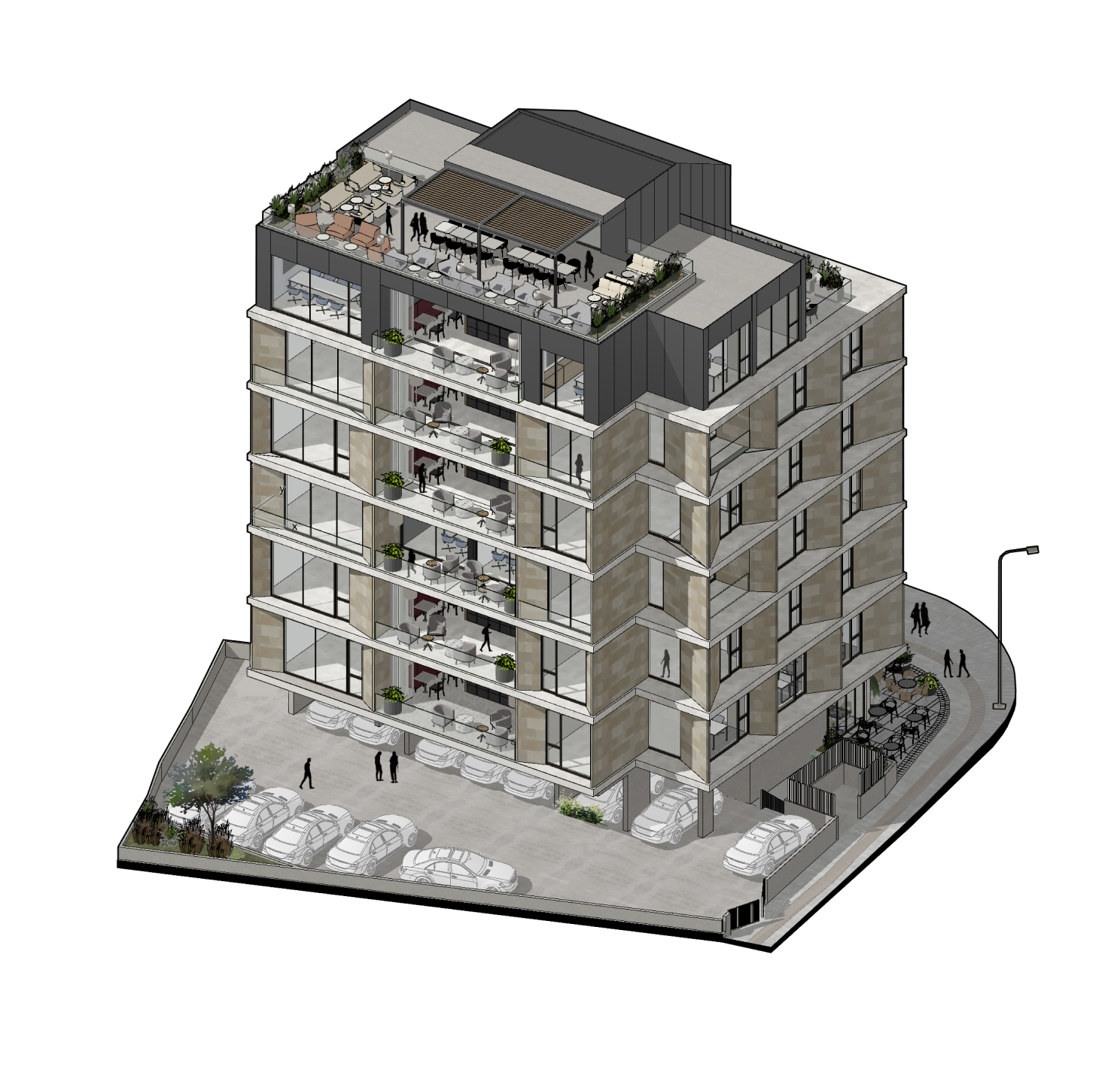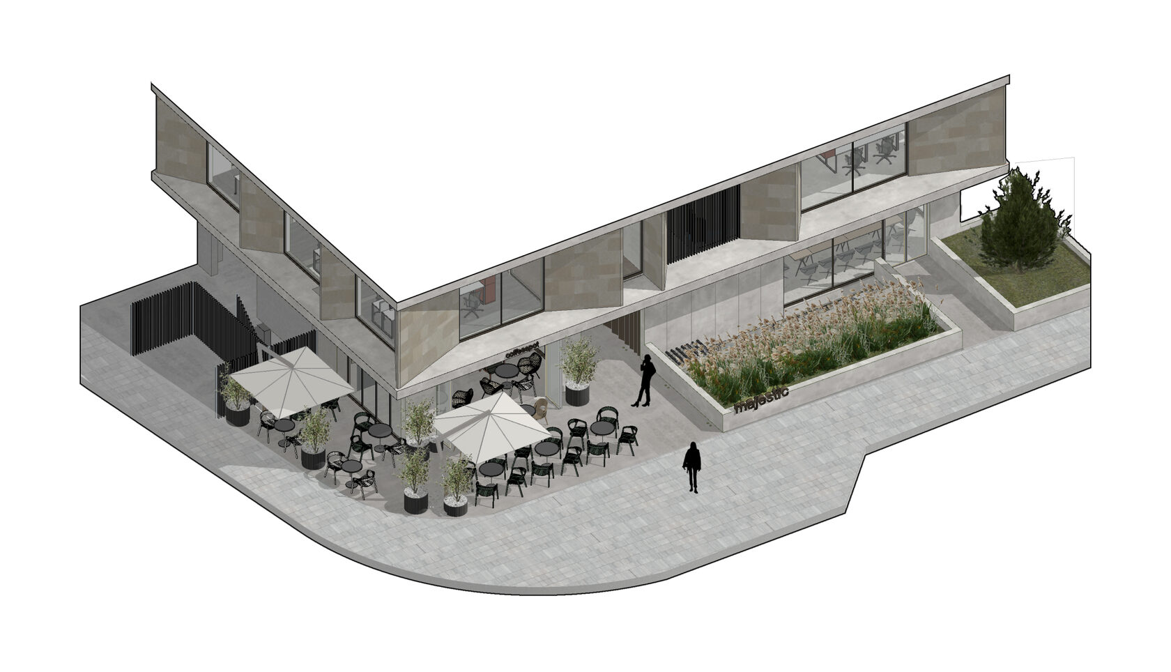 Majestic is a six-story building featuring public facilities on the ground floor and basement. The premises also include ample space for outdoor parking. There are no high-rise buildings in the city center. Since the project site is located on an elevated area, the upper floors offer a unique panoramic view of the entire city, including magnificent sea observe. The layout transitions from public functions on the lower floors to private functions on the upper floors. Thus, the lower levels feature areas such as a reception, café, informal zones and a multifunctional space.